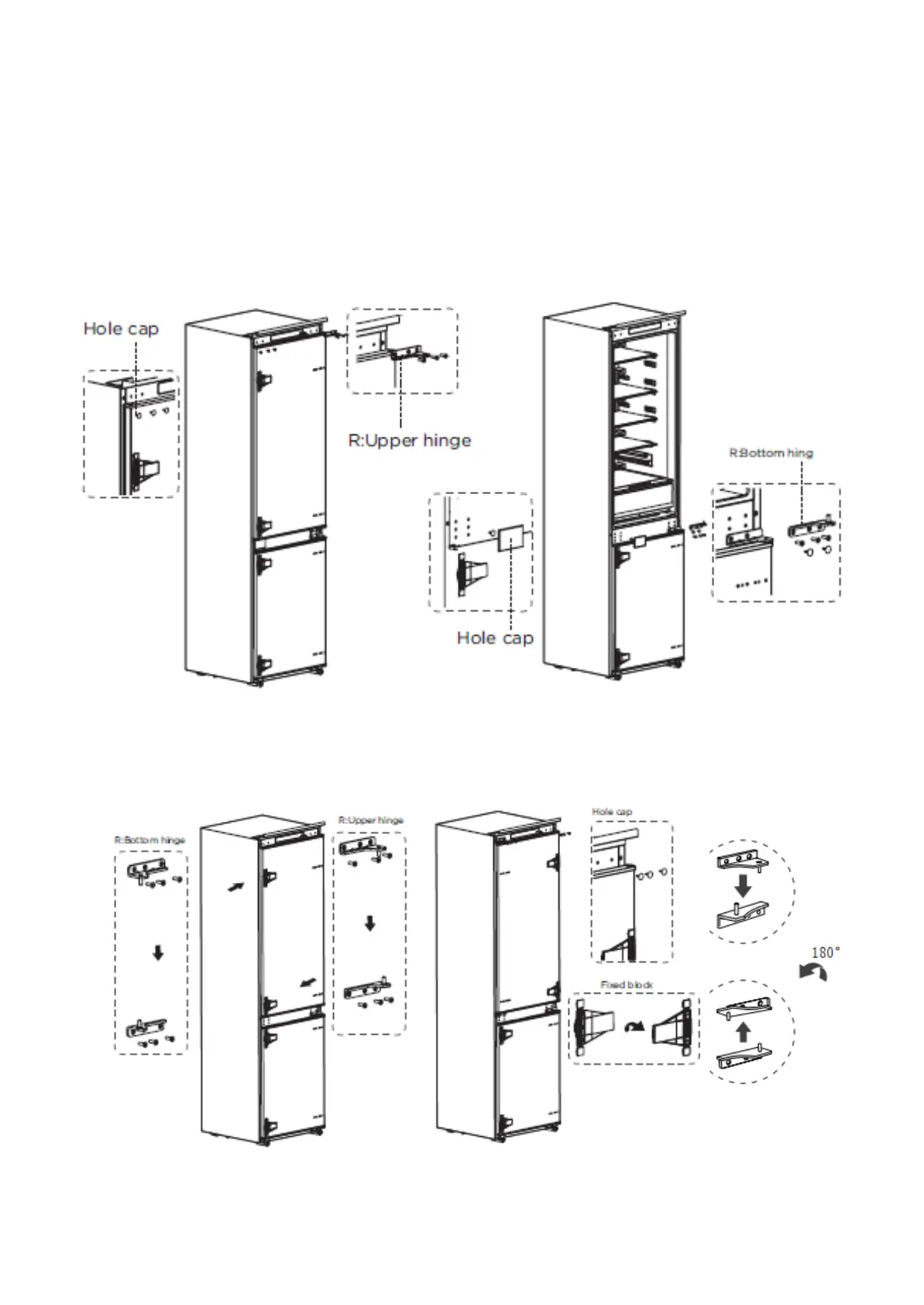 3. Retirez la porte du réfrigérateur, la charnière inférieure et les bouchons des trous.