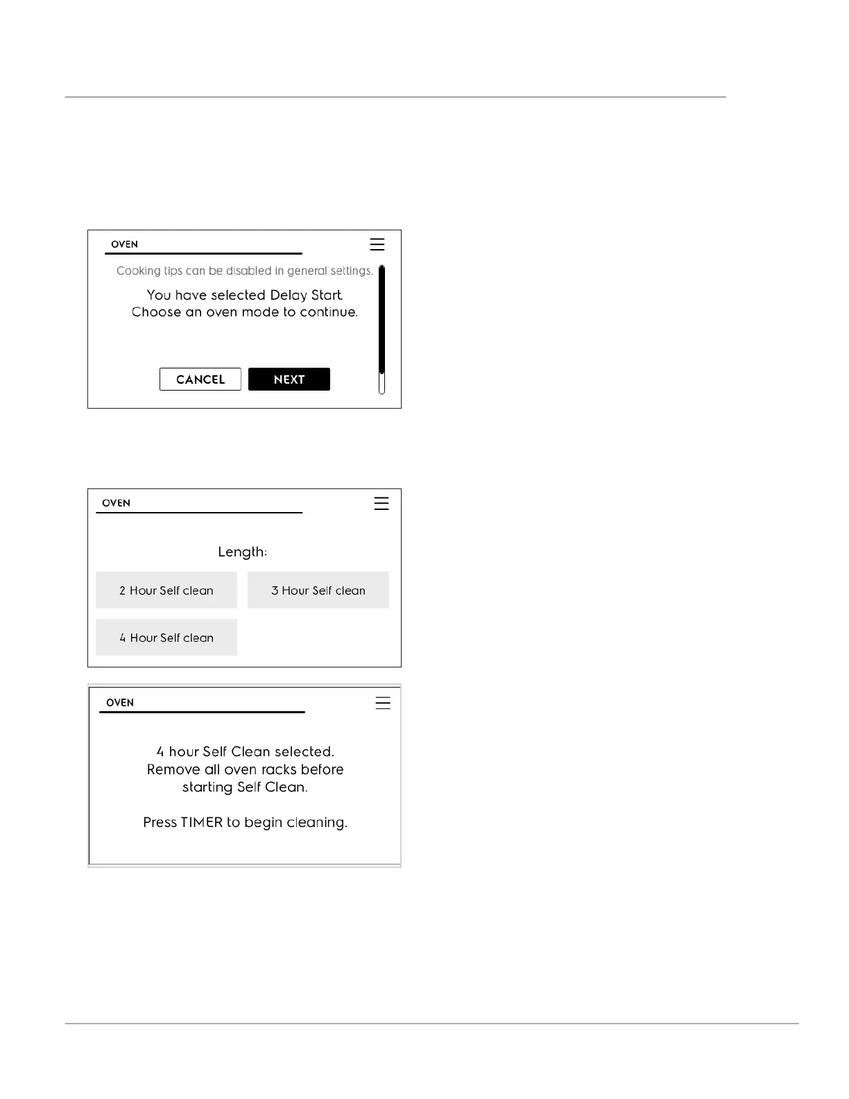 3. Touch NEXT and scroll Oven Modes to Self