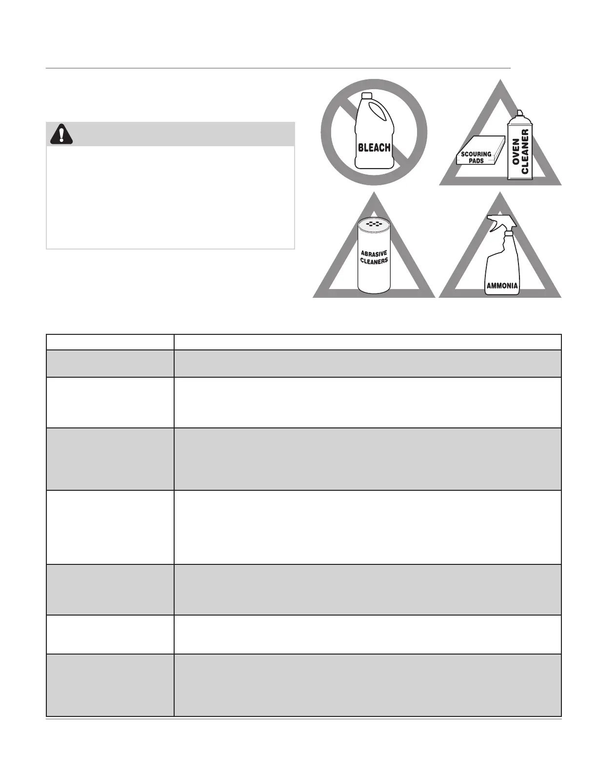 abrasives, chlorides, chlorine, or ammonia. These cleaners may damage the