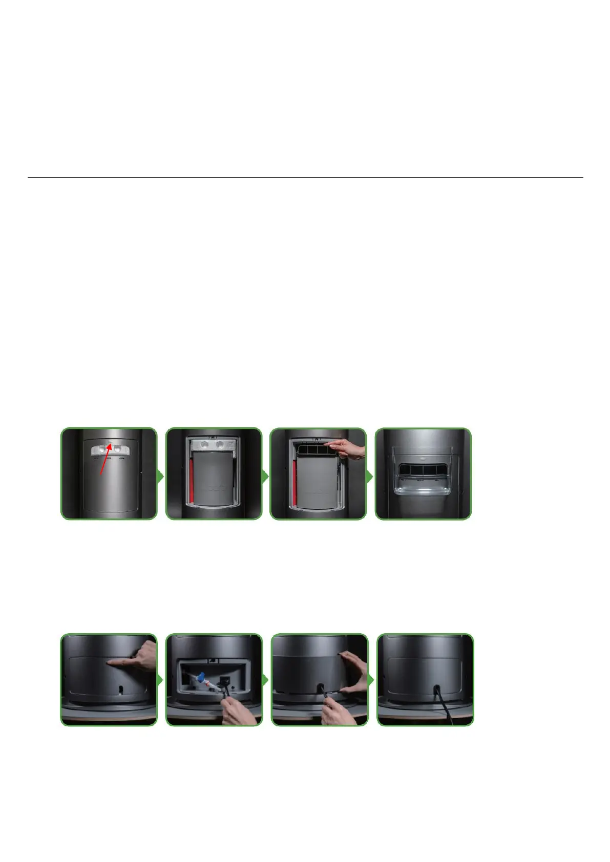 - Verwijder de emmer door deze m.b.v. het handvat uit het toestel te tillen, en verwijder de gele sticker onderaan.