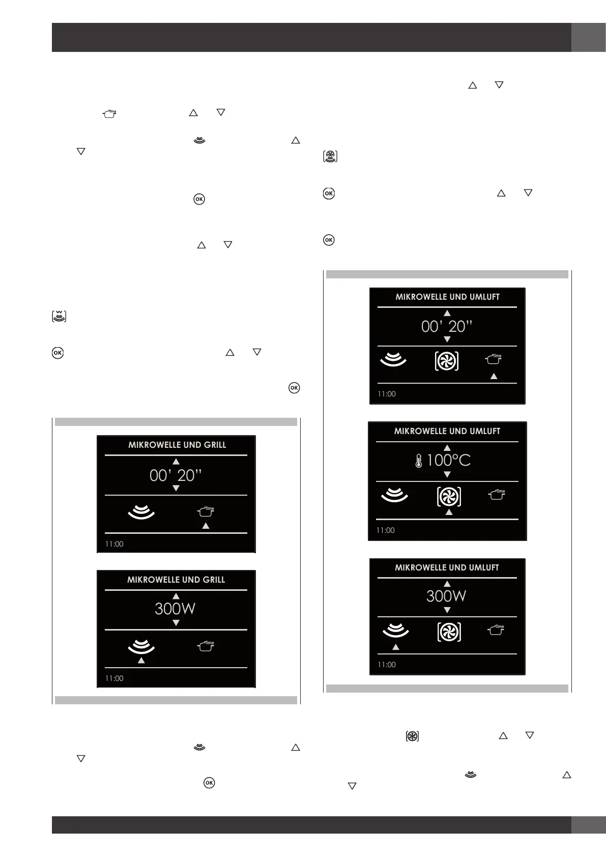 Die Ikone "Mikrowelle + Grill" mithilfe der Pfeile auswählen und Taste