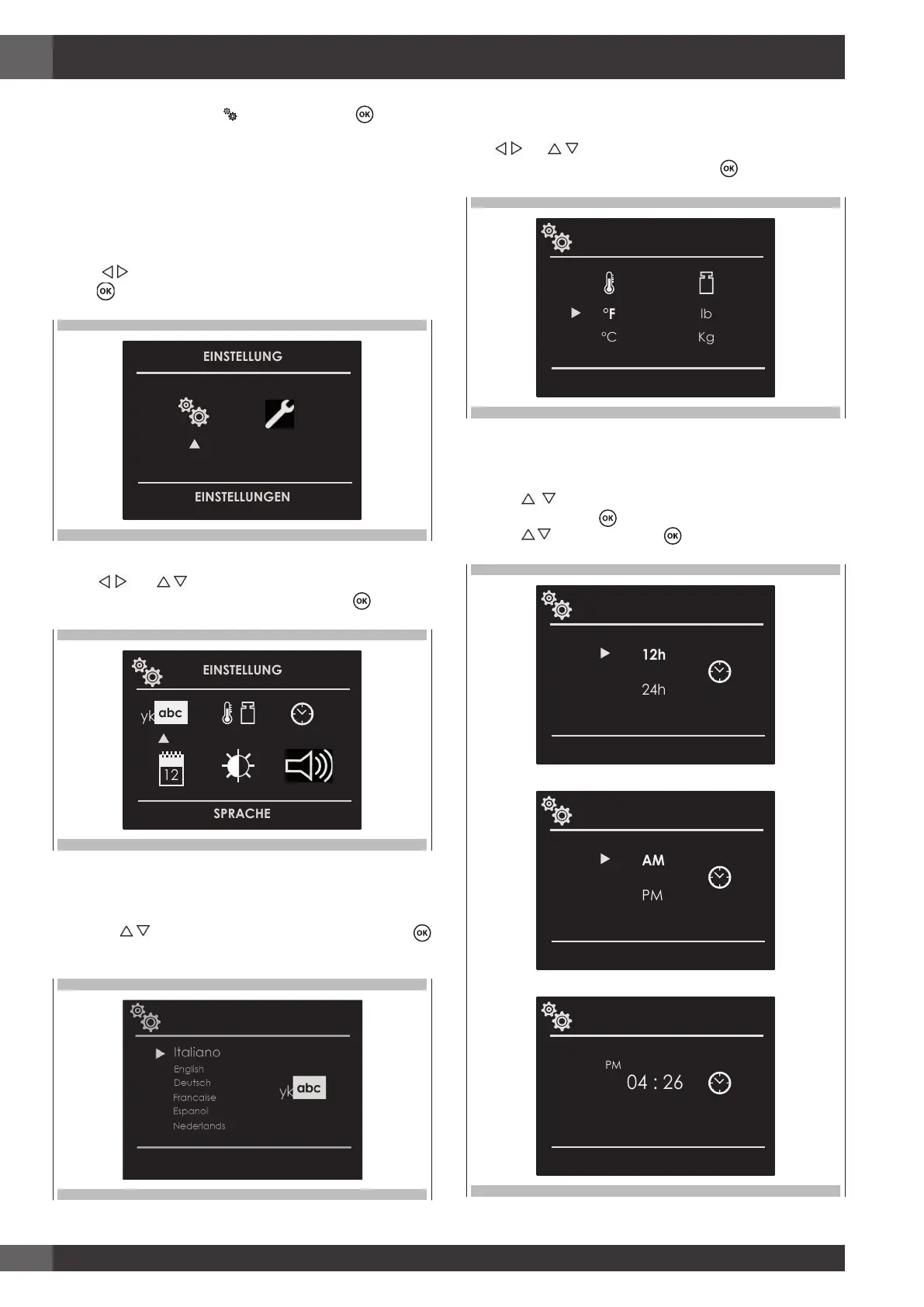 oder Gewichtsmaße Kg/ib zu wählen und mit Taste