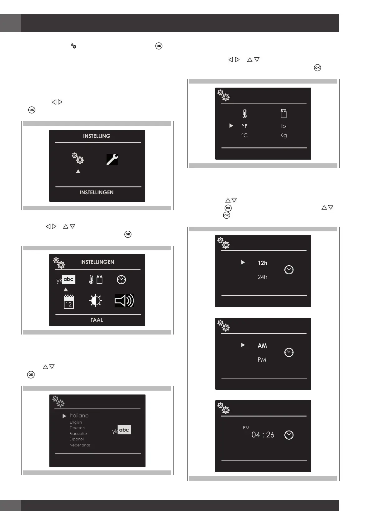 “°C/°F” of gewichtopties Kg/ib te selecteren en bevestig met de