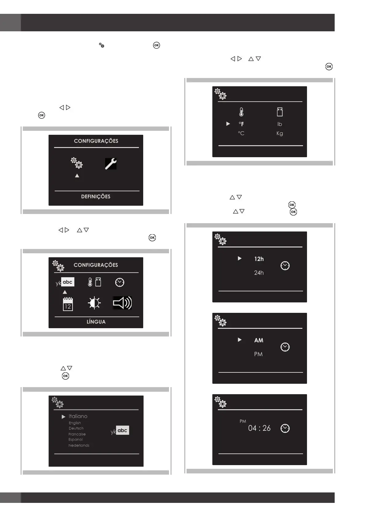 temperatura “°C/°F” ou as opções de peso Kg/ib e confirme com a tecla