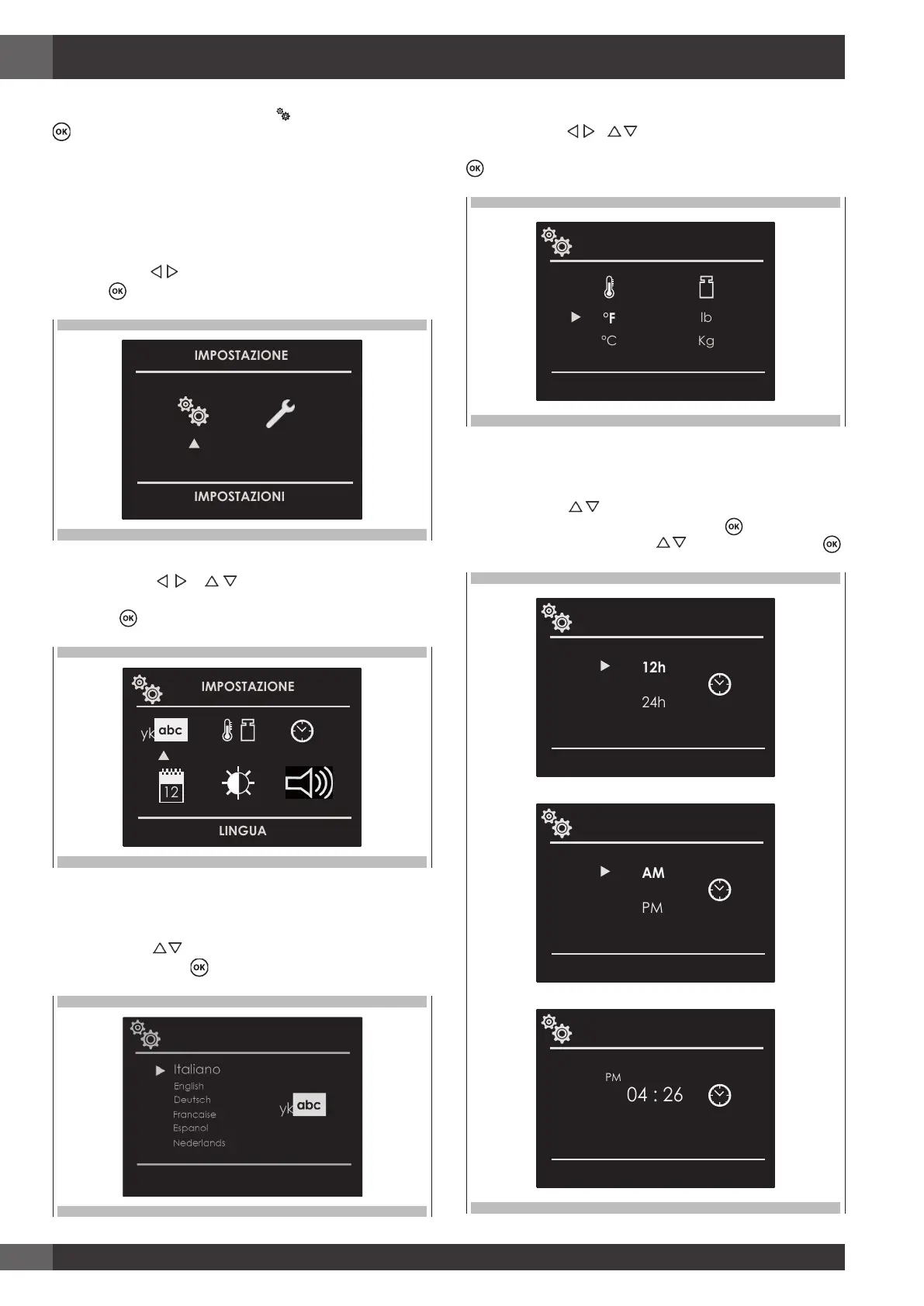 temperatura“°C/°F”oopzionipesoKg/lbeconfermareconiltasto