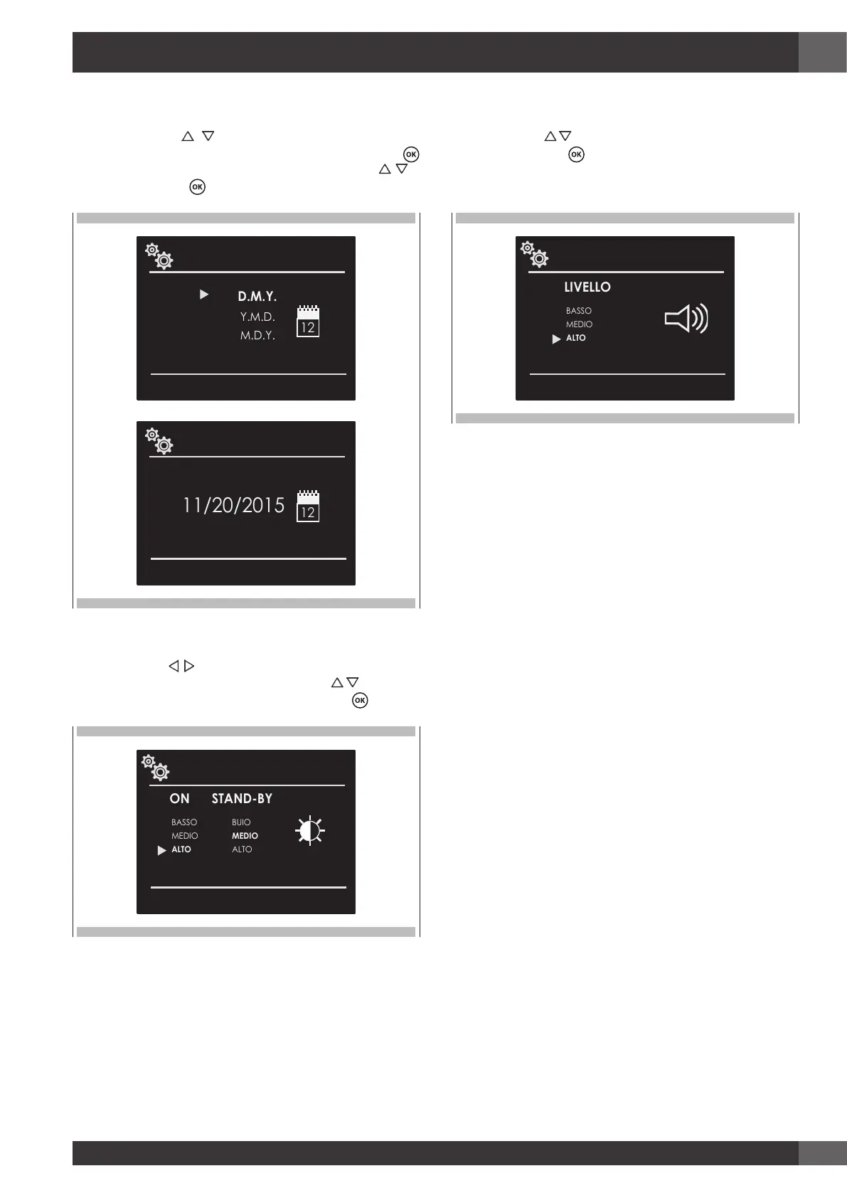cambiare tra ON o STANDBY, poi tramite le frecce selezionare