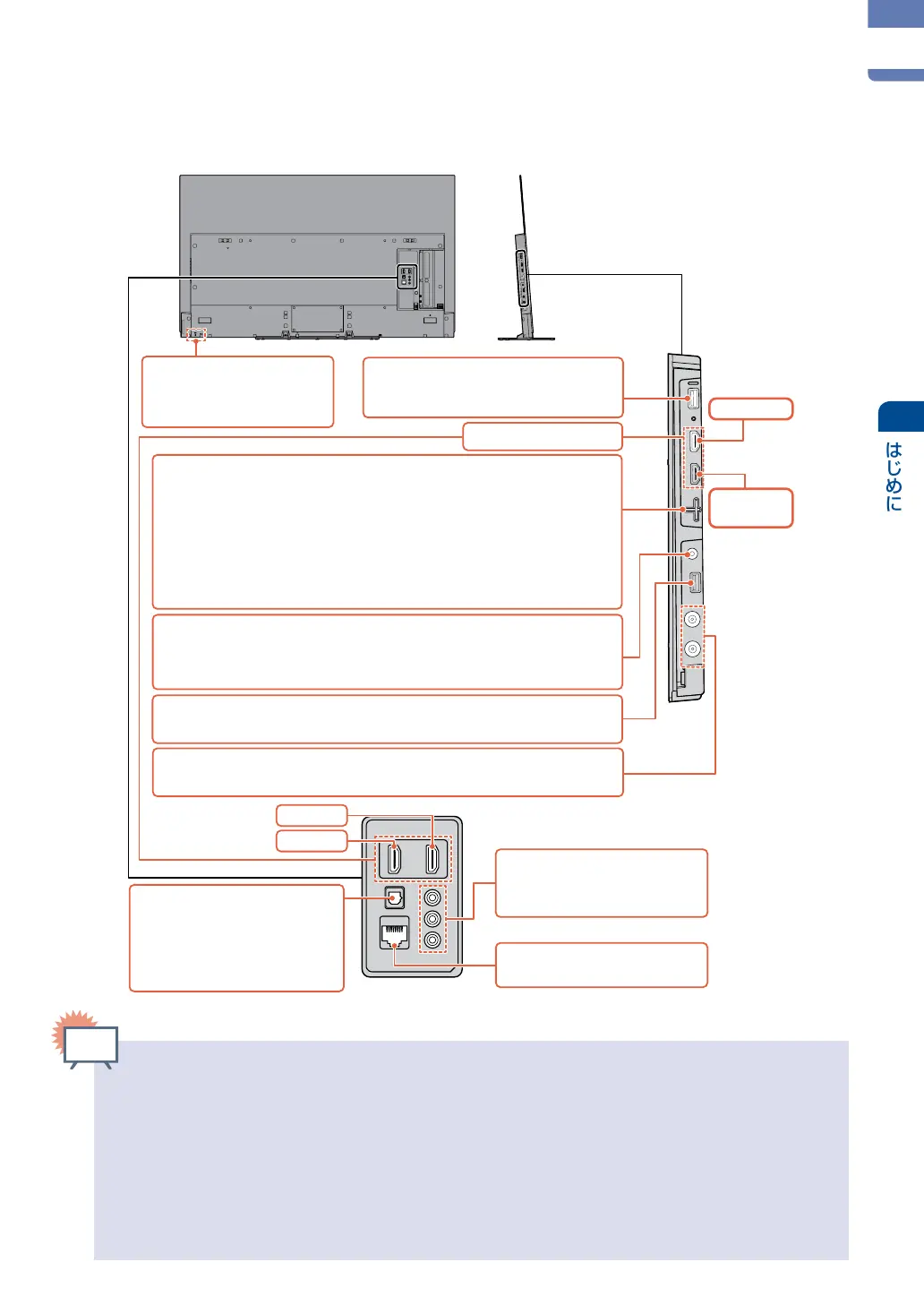 HDMI3・4端子、光デジタル音声出力端子、LAN端子、ビデオ入力端子にケーブルを接続するときは、背面端子カバーを