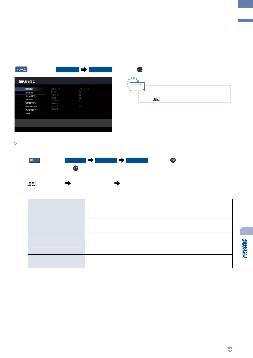 「各種設定」 「画質を設定する」 「映像モード」をご覧ください。