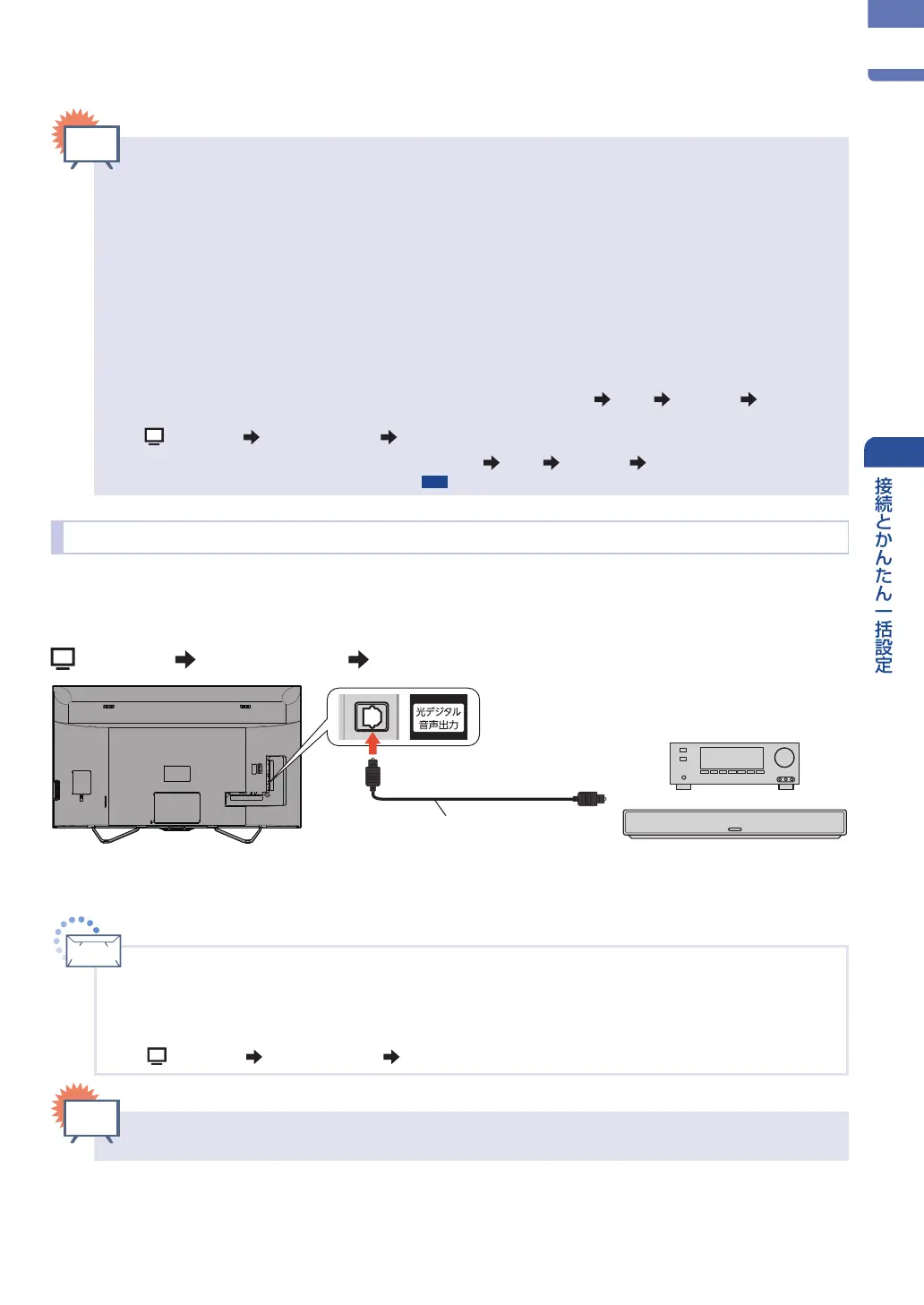 のサラウンドを迫力ある音声で楽しむことができます。接続後は、接続先に合わせて[デジタル音声出力]の