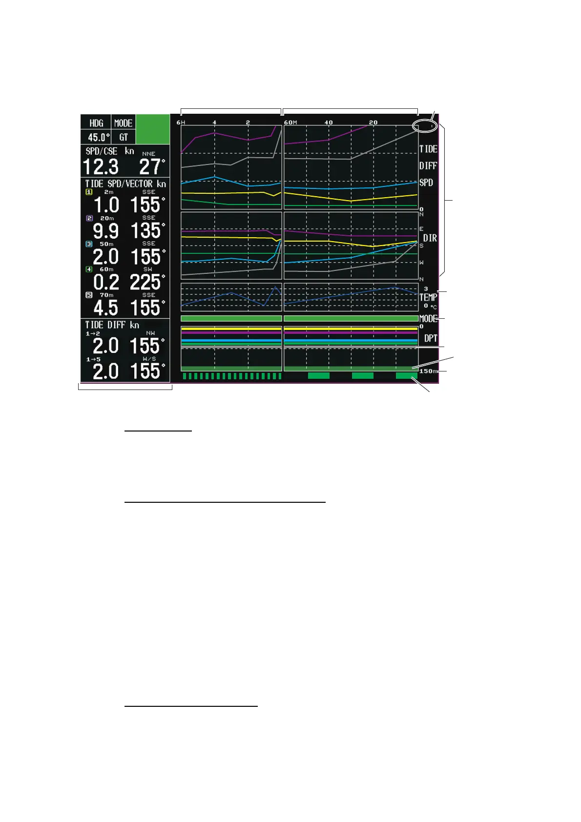 The maximum range for the speed (upper graph) is set with [TIDE RANGE] in the