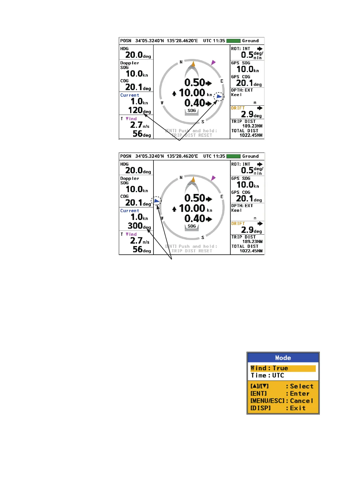 風向は相対方位、真方位または [Theoretical] で表示できます。また [OFF] を選択す