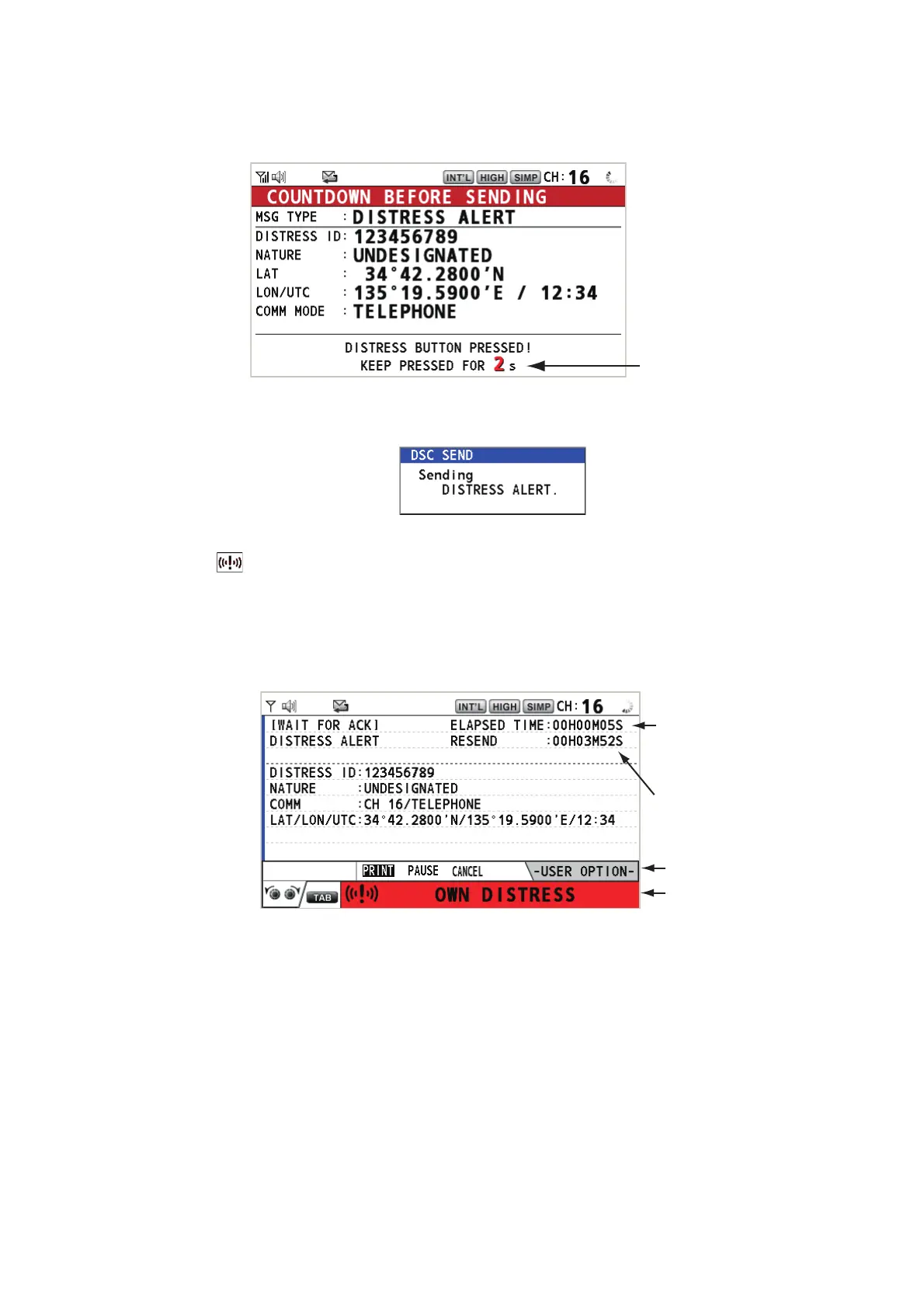 for two seconds and the message "Sending DISTRESS ALERT." appears.