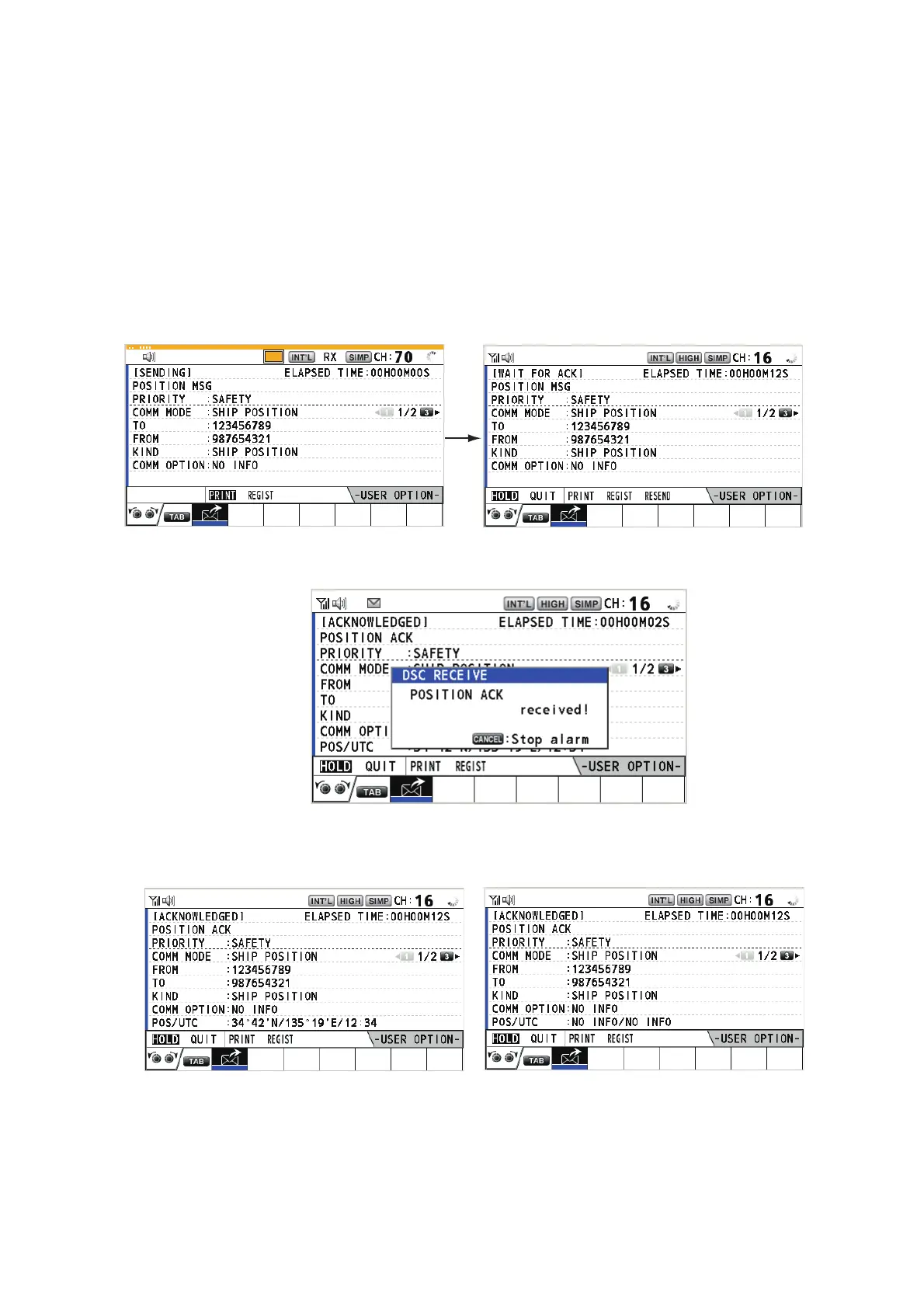 pop-up message "POSITION ACK received! [CANCEL]: Stop alarm" appears.