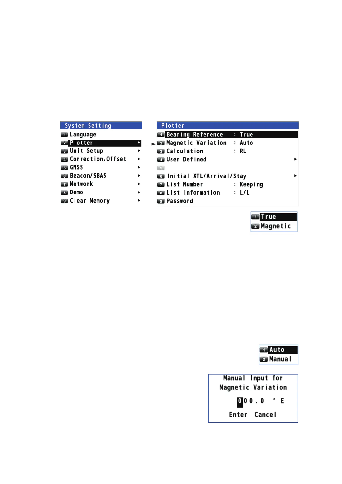 Ship’s course and bearing to a waypoint are displayed in true or magnetic bearing.