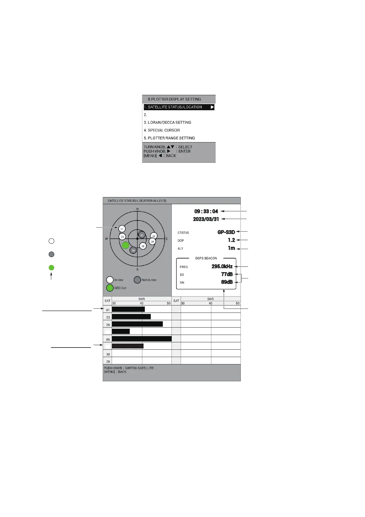 The satellite status/location display provides data about the GPS satellites and GEO