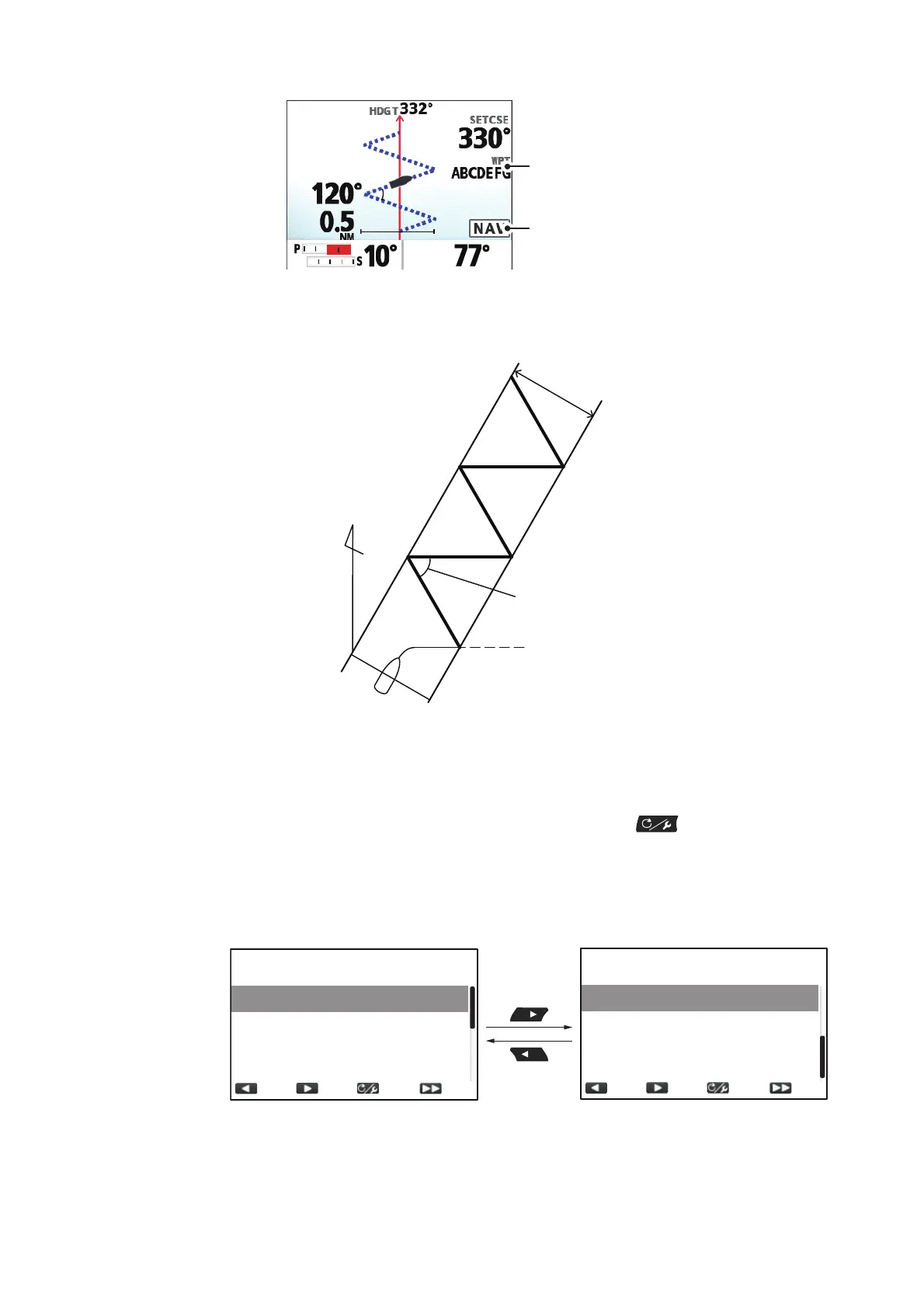 ジグザグ走行は、現在の位置から開始します。ターン角度、および幅をメニューで