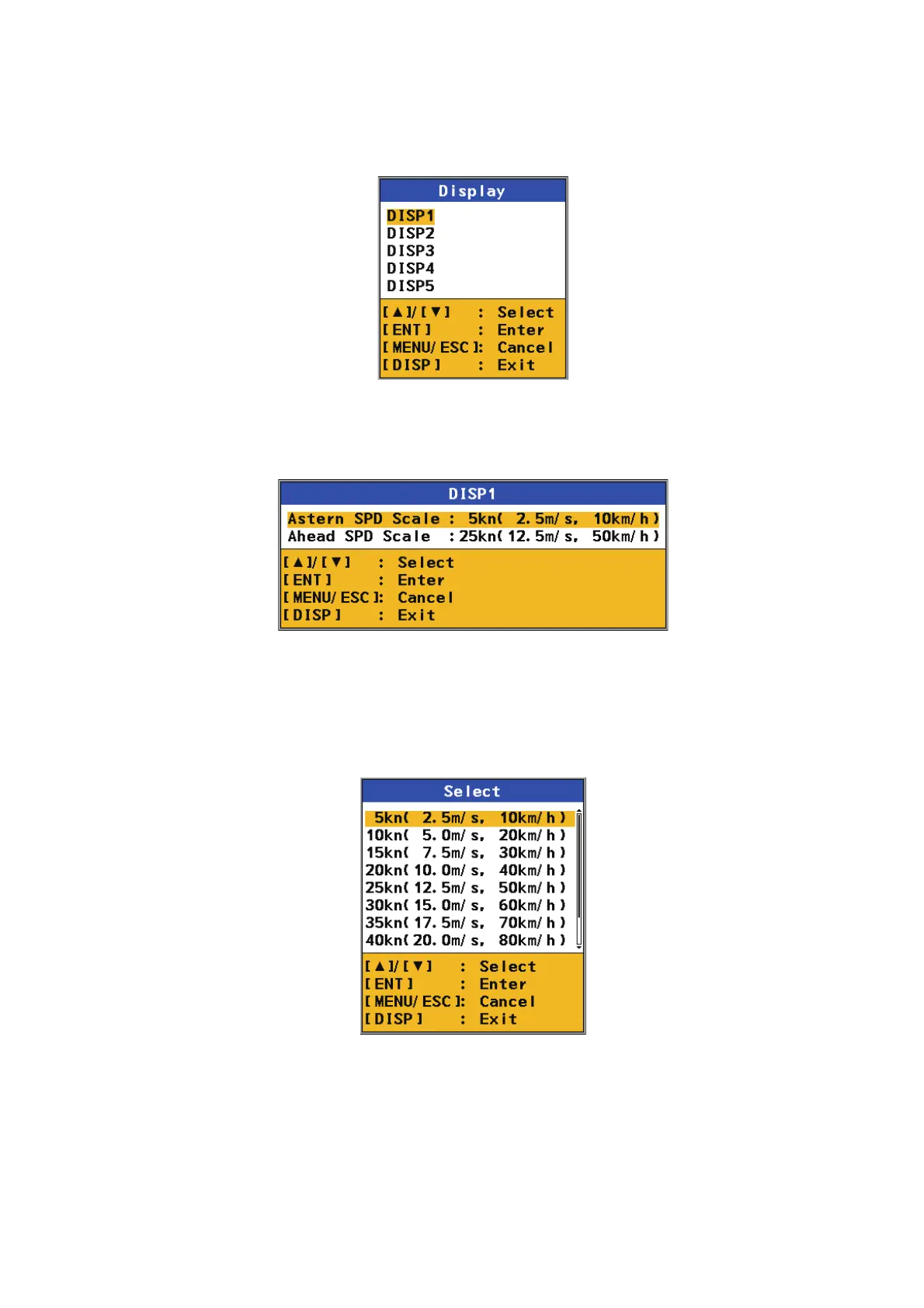 4. Press S or T key to select [DISP1 (2, 3, 4 or 5)], which shows the speed graphic