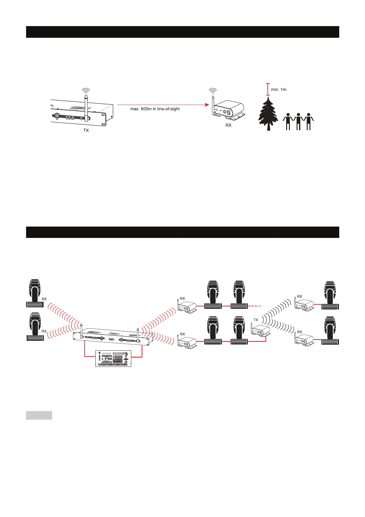 sends it via RF. Receivers with the same transmission protocol receive the RF signal and distribute it as a DMX