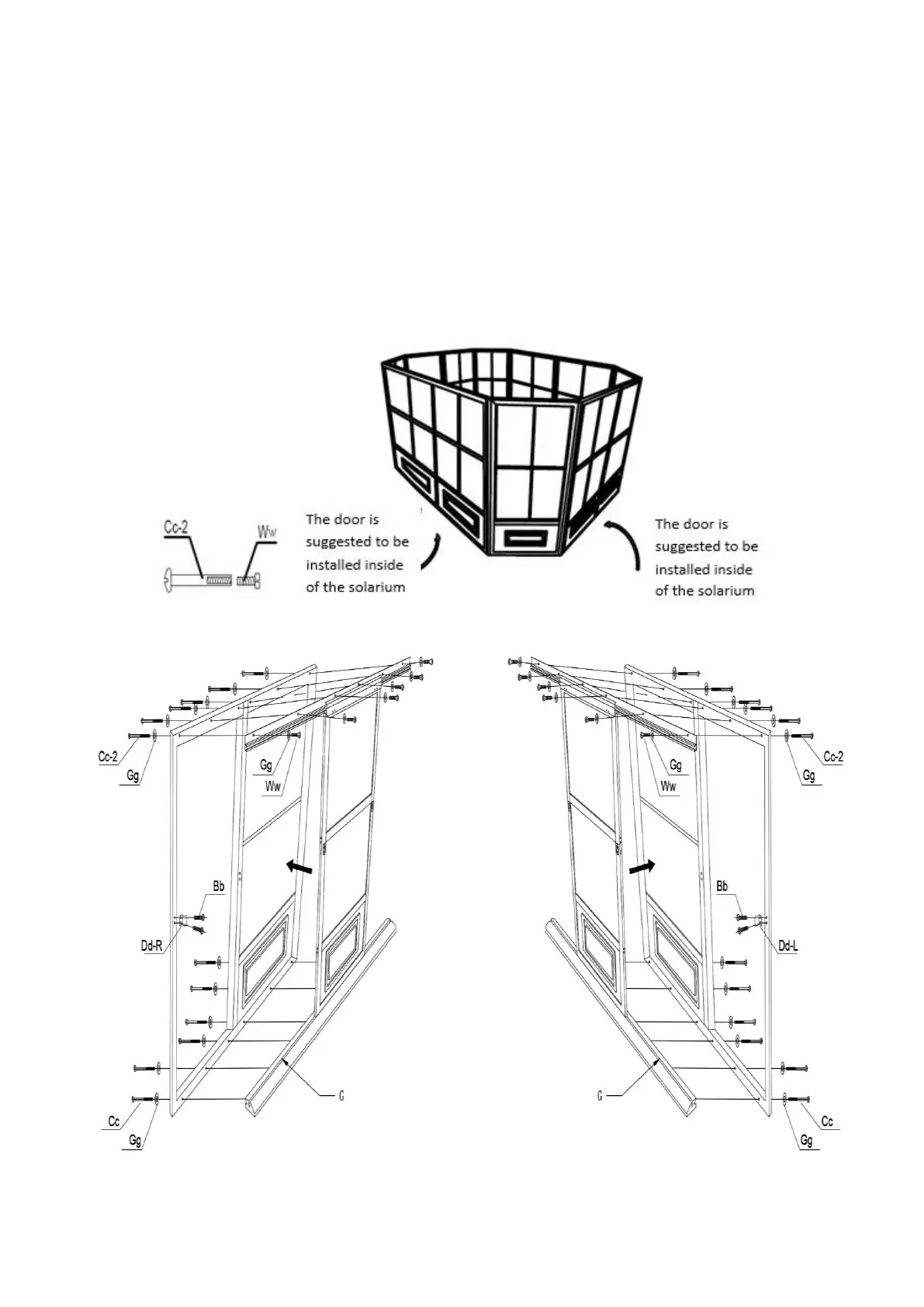 1. Place a Bolt (Ww) and Washer (Gg) through the Top Door Frame (D) and Door Top Rail (F),