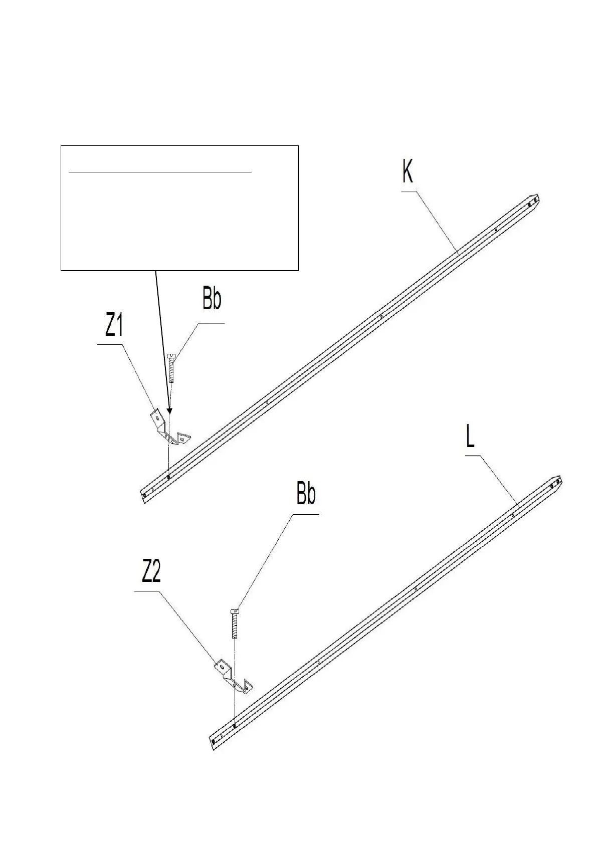 Pre-assembled steel angle (Z1, Z2) to roof Rafters (K, L) respectively, using Bolts (Bb).