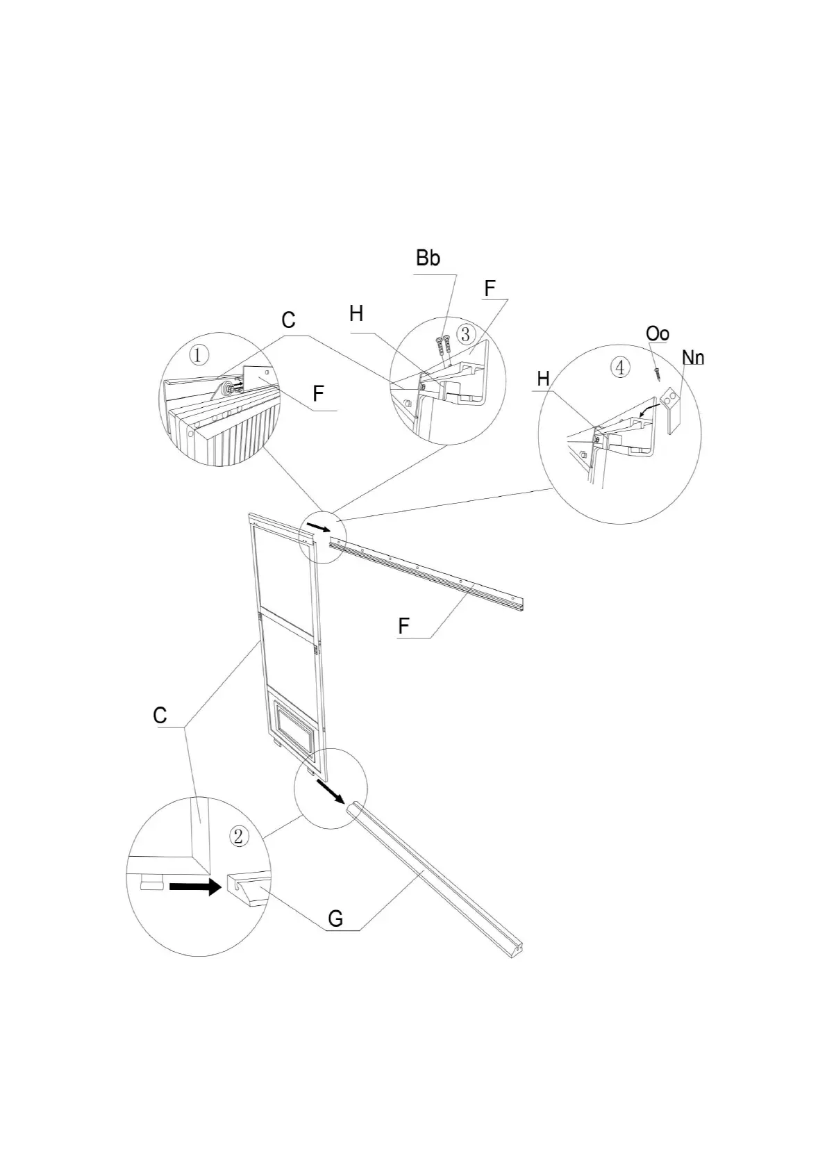 3. Use Bolts (Bb) to affix the plastic Stoppers (H) one on each end of Top Door Rail (F).