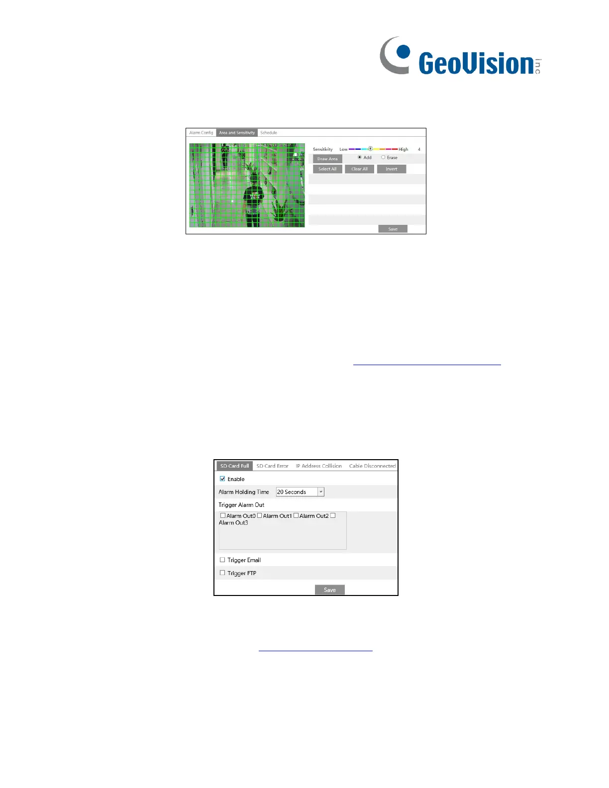 2. Set motion detection area and sensitivity. Click the “Area and Sensitivity” tab to go to the