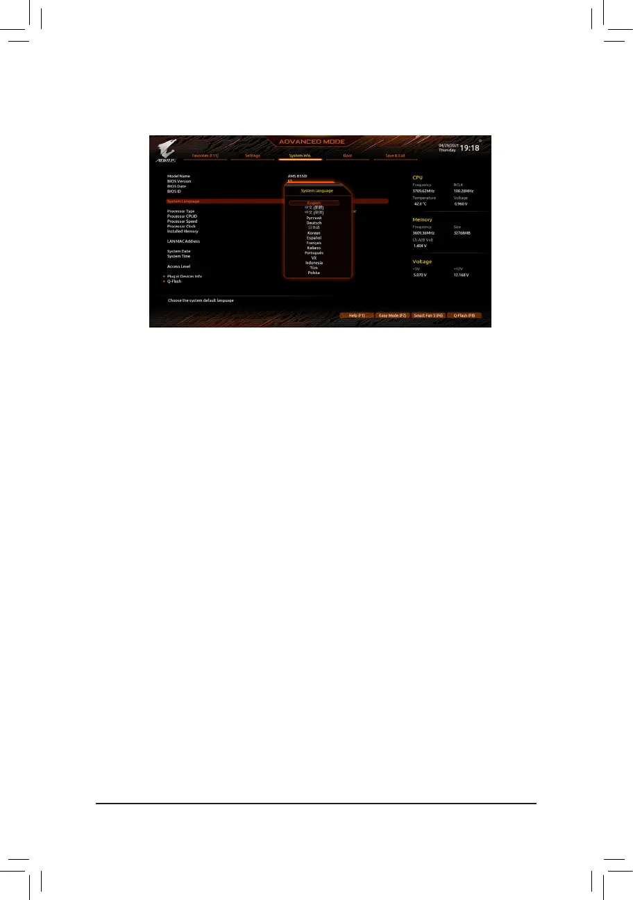 若要更BIOS设置程序显示的语请至System Info.选单System Language选项提供您