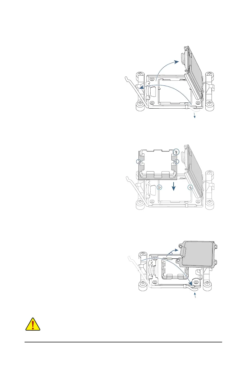 CPU未正確置入CPU插槽時,切勿強行將CPU插槽拉桿下壓扣住,以免造成CPU及插槽