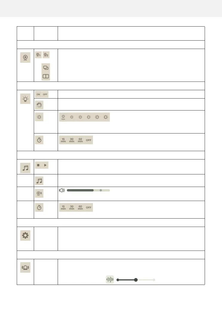 • Schaltet das Nachtlicht dauerhaft ein oder nach 15, 30, 60 Minuten aus