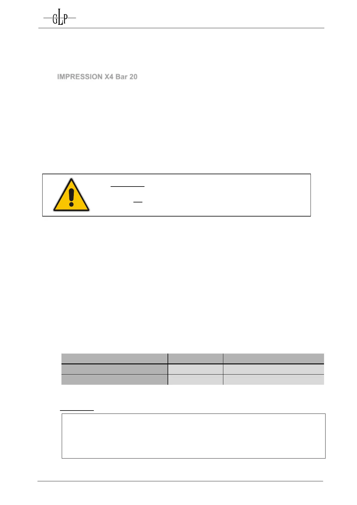 Bekijk gratis de handleiding van GLP impression X4 Bar 20, stel vragen en lees de antwoorden op veelvoorkomende problemen, of gebruik onze assistent om sneller informatie in de handleiding te vinden of uitleg te krijgen over specifieke functies.
