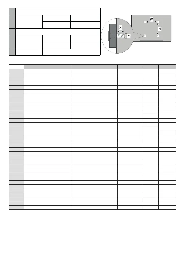 Misurazioni installazione a parete VESA Dimensioni schema foro (mm) Dimensioni vite Lunghezza (X) Filettatura (Y)