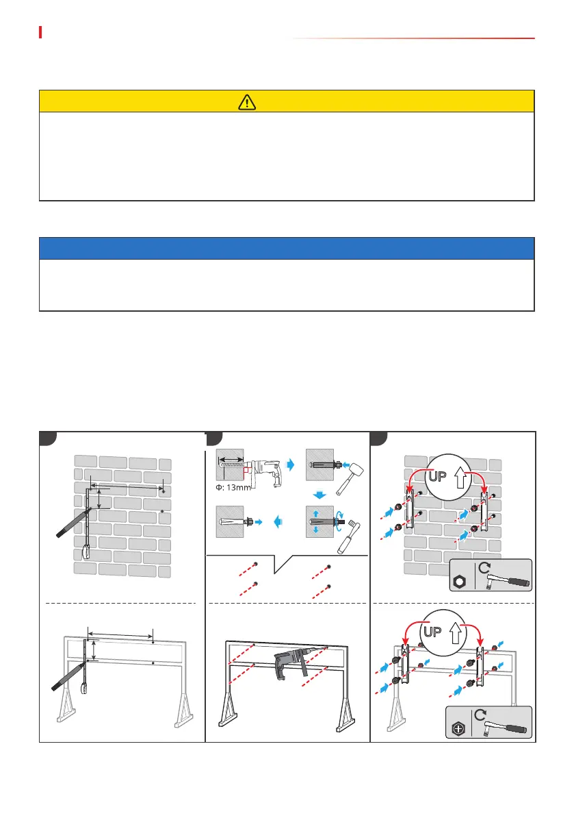 • Avoid the water pipes and cables buried in the wall when drilling holes.
