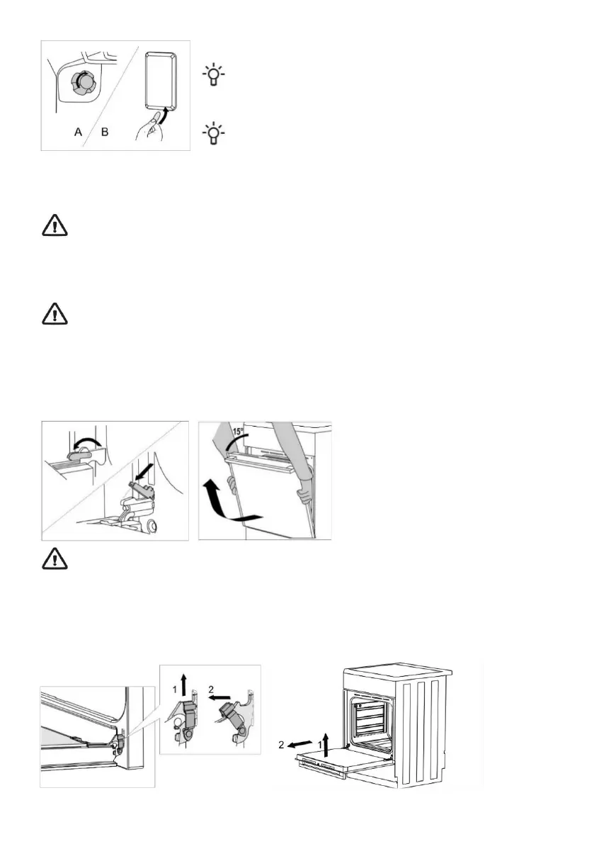 • Slowly close the oven door, lift it slightly and pull it out from the both hinges of the appliance.
