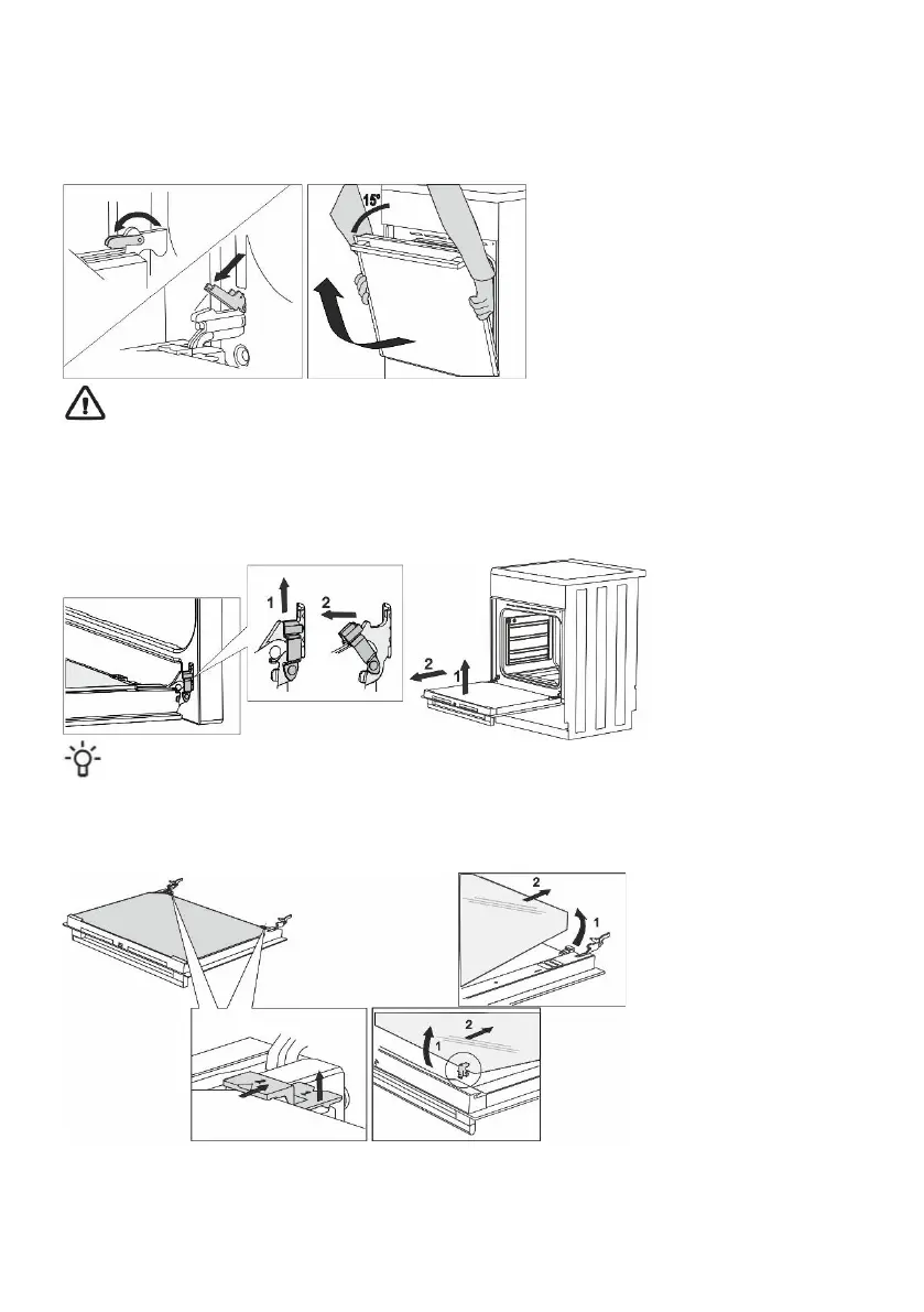 15° (regarding to the closed door position), slightly close the door and pull it out from both hinges of the appliance.