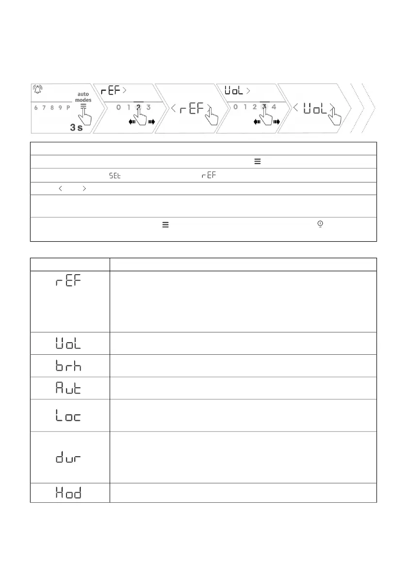 5. Exit user settings by touching key for 3 seconds (settings are saved) or key (settings are