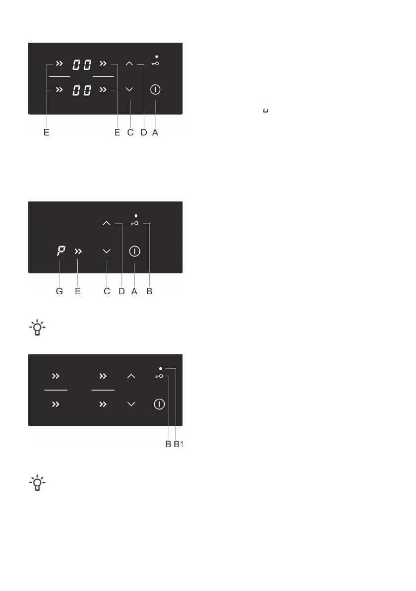 Power level can be changed at any time by selected the desired cooking zone (E) and adjusting the setting by touching