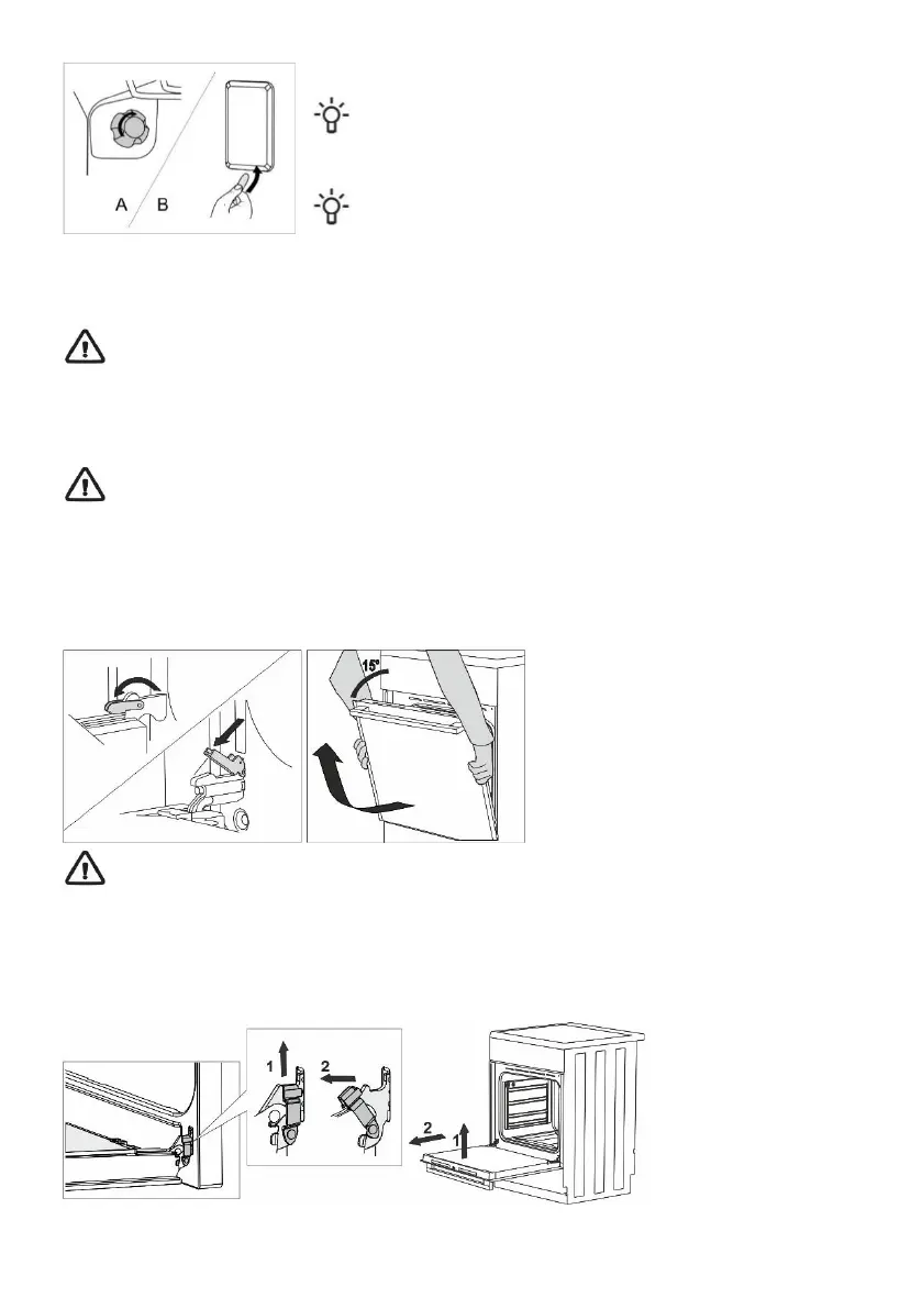 • Slowly close the oven door, lift it slightly and pull it out from the both hinges of the appliance.
