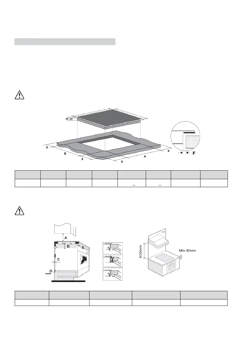 Note: The safety distance between the hob and the cupboard above the hob should be at least