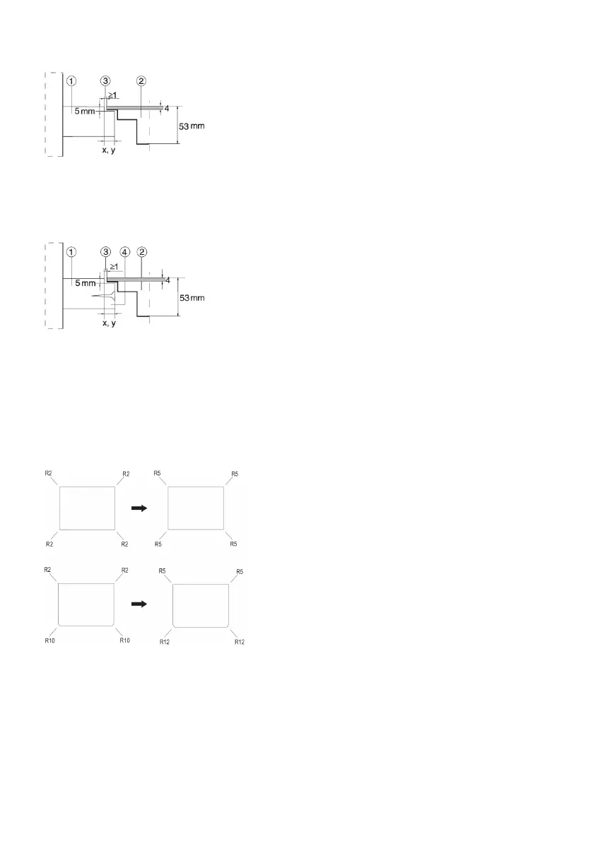 Observe the radii of glass edges (R10, R2) when making the cut-out.