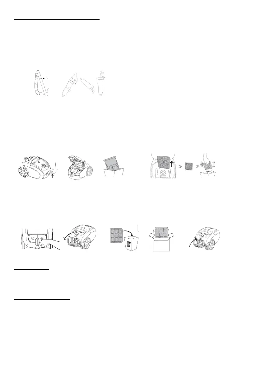 // Uklonite držač kese za prašinu. // Uklonite napunjenu kesu za prašinu. // Umetnite novu kesu za prašinu