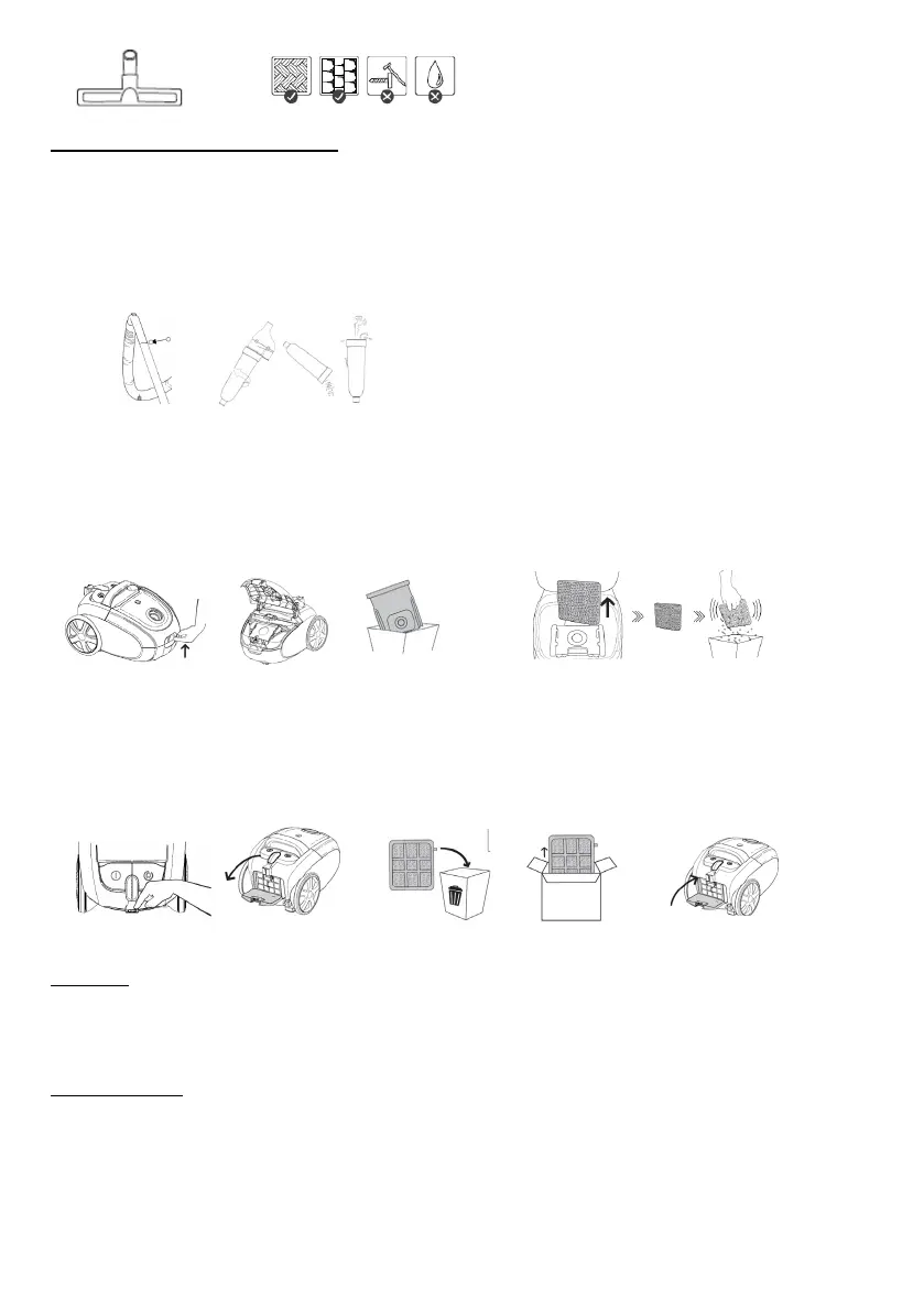 megnyomásával). // Távolítsa el a porzsáktartót. // Távolítsa el a megtelt porzsákot. // Helyezze be az új