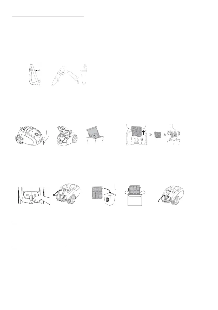 // Vyjměte držák sáčku na prach. // Vyjměte plný prachový sáček. // Vložte nový prachový sáček do držáku