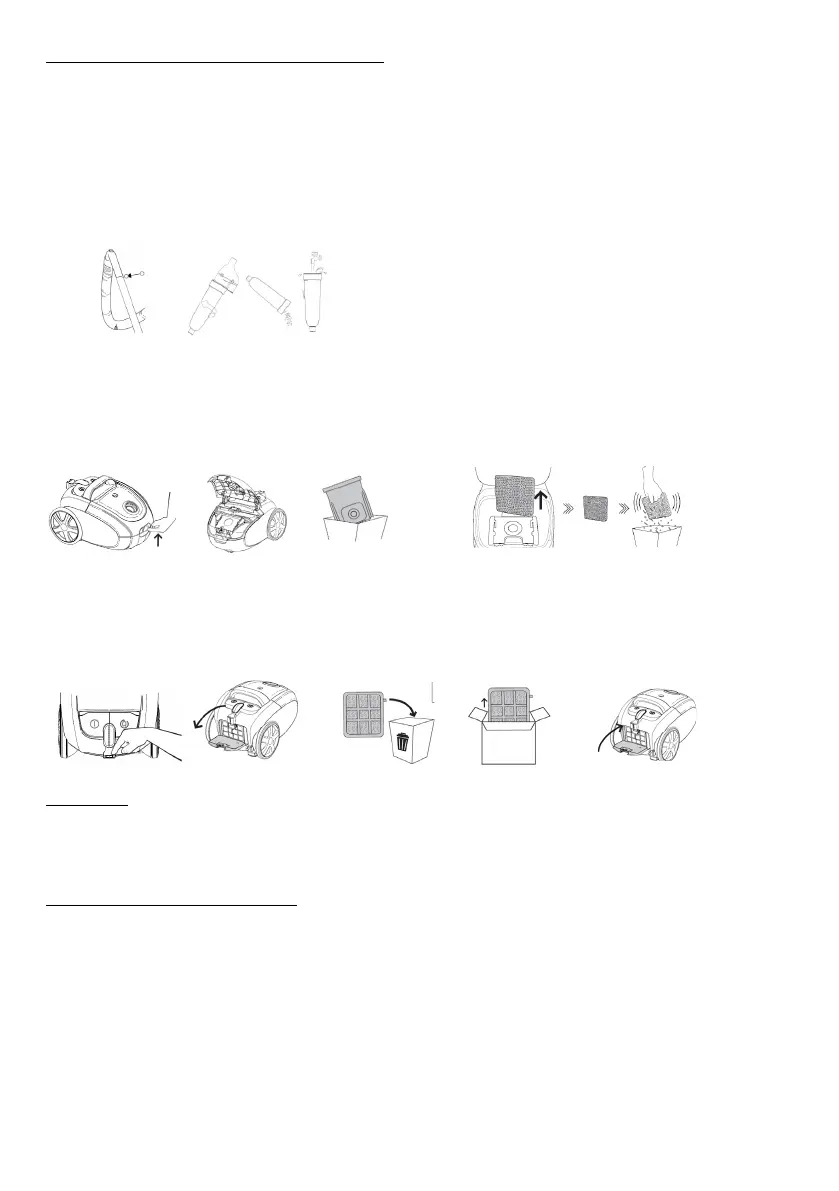 // Снимите держатель мешка. // Извлеките заполненный мешок. // Вставьте новый мешок в