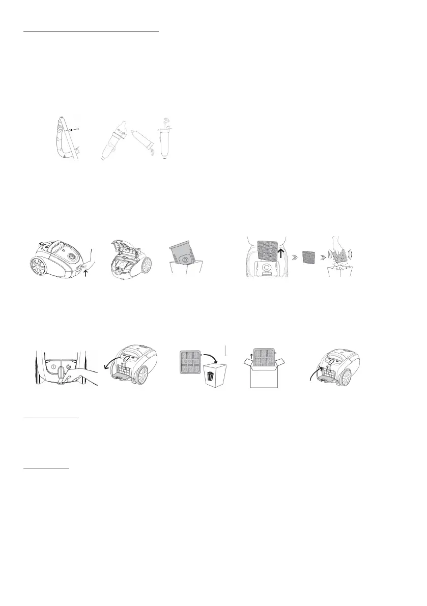 Støvsugerposer skal byttes ut når de er fulle. Åpne dekselet (ved å trykke på knappen). Fjern