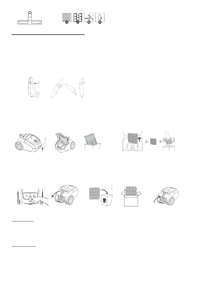 När det gäller dammsugarpåsar bör de bytas ut när de är fulla. // Öppna locket (genom att trycka på