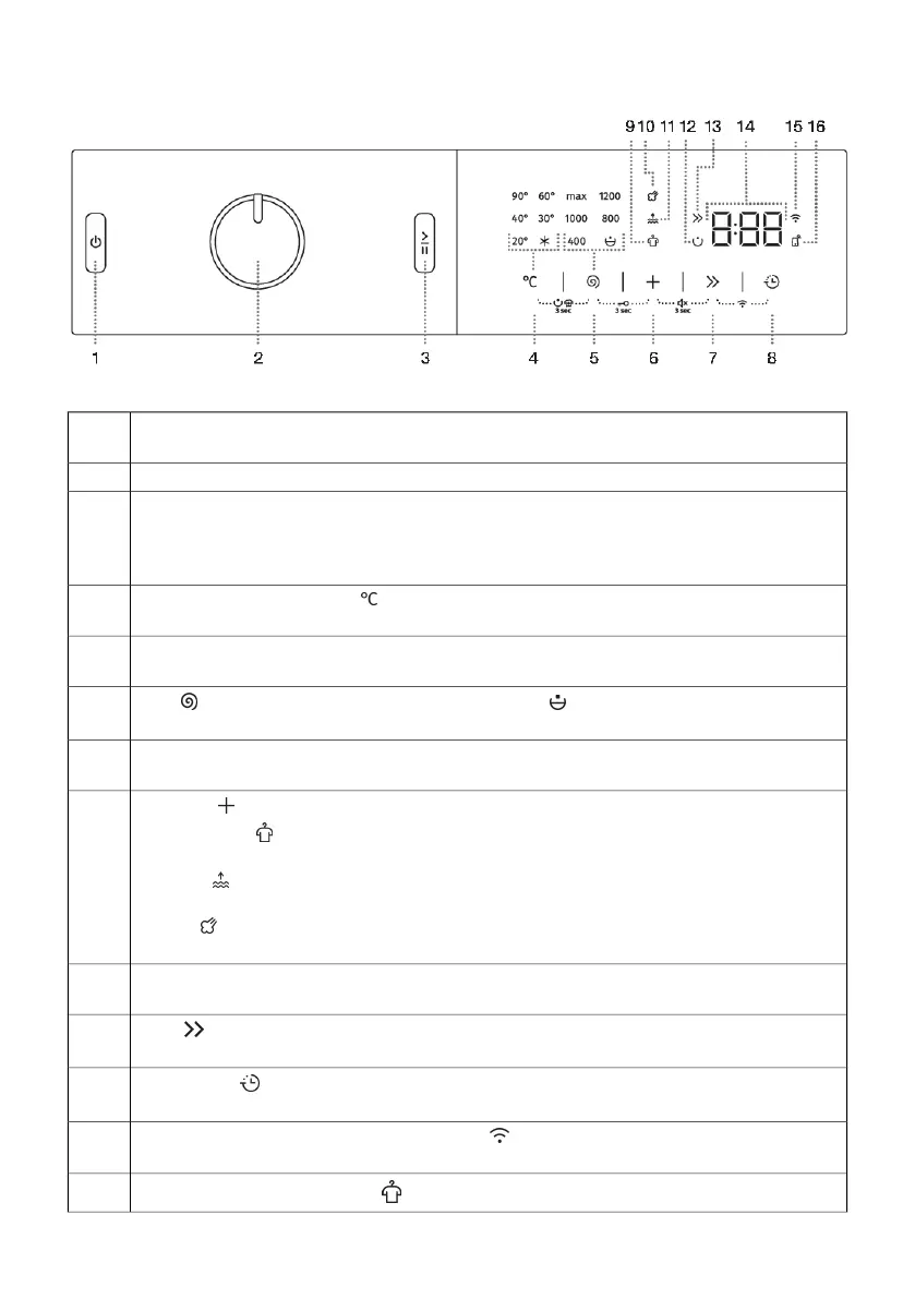Use this button to turn the washing machine on and off, and to reset the washing programme.