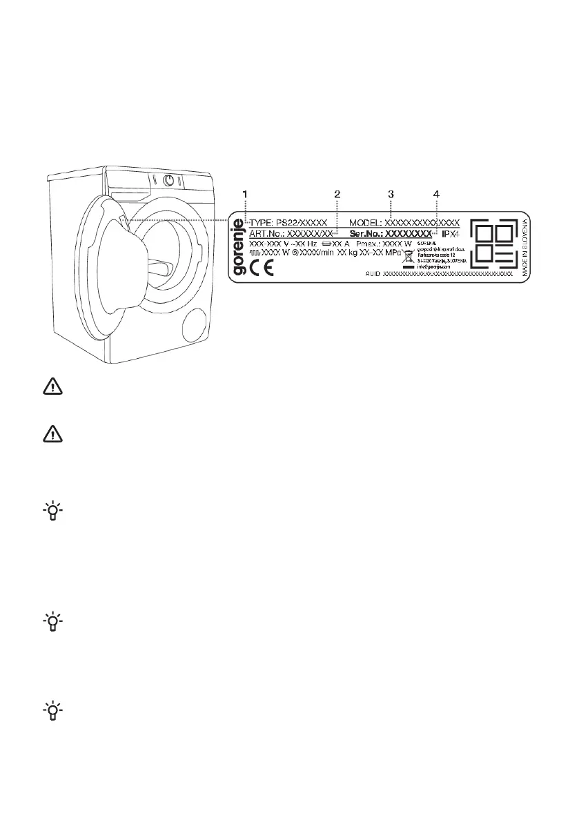 When you contact a service centre, please state your washing machine's type (1), code/ID (2), model