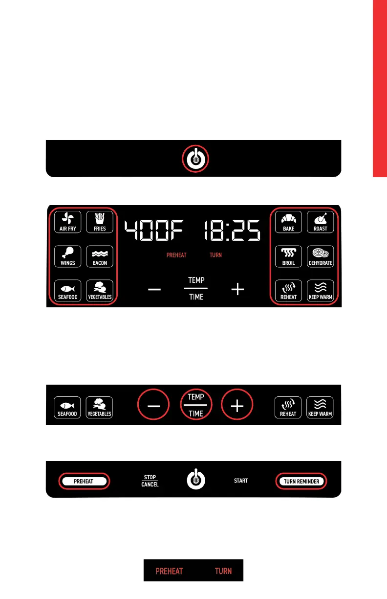 PREHEAT / TURN aparecerá en rojo en la pantalla cuando estén activados.