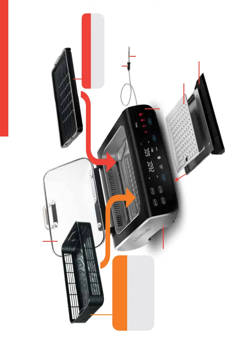 Utilisation : Pour les grillades, le couvercle peut être laissé ouvert ou fermé. Pour la cuisson dans le panier de friture à air