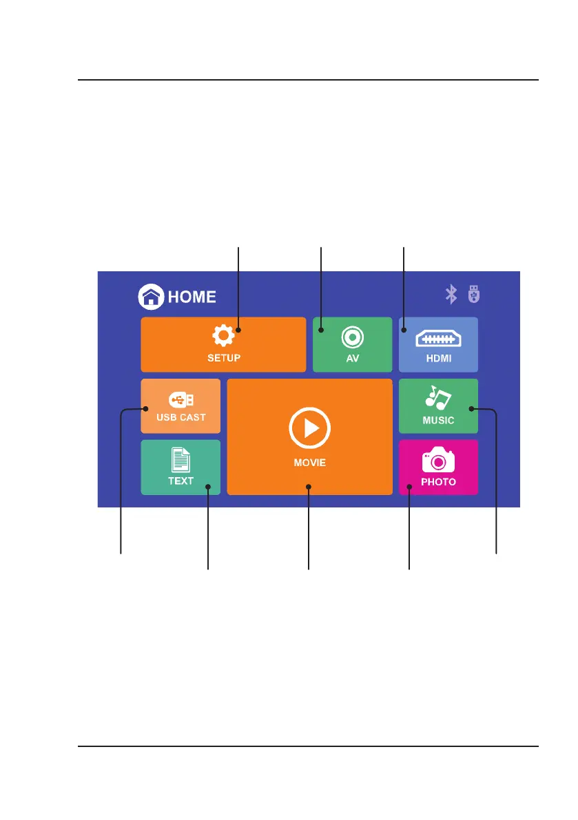 This is the default screen that will appear after powering on the projector. The icons that appear will either access